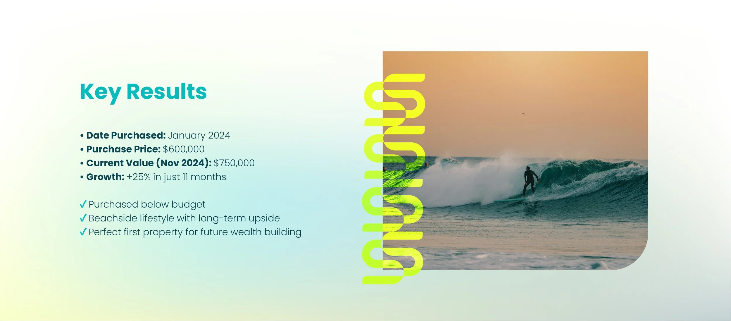 After narrowing down the options, we secured him a two-storey, two-bedroom unit in a small complex just a short walk from the beach — and under budget. The property ticked every box: lifestyle, location, and long-term potential.